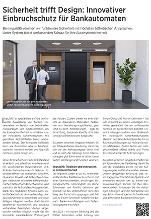 Die Sicherung der Selbstbedienungsanlagen und Geldautomaten von Banken ist wichtiger denn je. Unsere Spezialsparte für Raumkonzepte hat sich dieser Thematik angenommen und ein neues Sicherheitssystem entwickelt, das allen Sicherheitsrichtlinien und Anforderungen entspricht – Secure Guard i95.